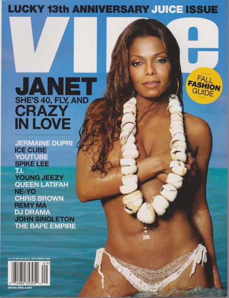 Janet Jackson appeared on the cover of Vibe magazine wearing nothing but a skimpy bikini bottom and a necklace made of large shells. The 40-year-old singer had recently lost about 60 pounds.