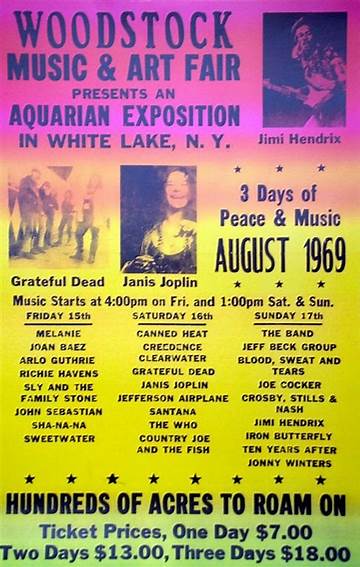 1969: Woodstock Festival was held on Max Yasgur's 600 acre farm in Bethel outside New York. Attended by over 400,000 people, the event featured, Jimi Hendrix, Joe Cocker, Crosby Stills Nash & Young, Santana, The Who, Creedence Clearwater Revival, Grateful Dead, Janis Joplin, The Band, Canned Heat, Joan Baez, Melanie, Ten Years After, Sly and the Family Stone, Johnny Winter, Jefferson Airplane, Ravi Shanker, Country Joe and the Fish, Blood Sweat and Tear and Arlo Guthrie. During the three days there were three deaths, two births and four miscarriages.