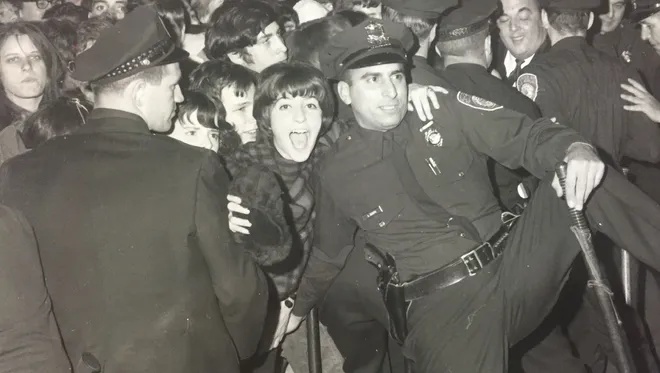 Rochester, New York police halt a Rolling Stones concert until over 3,500 screaming fans return to order.